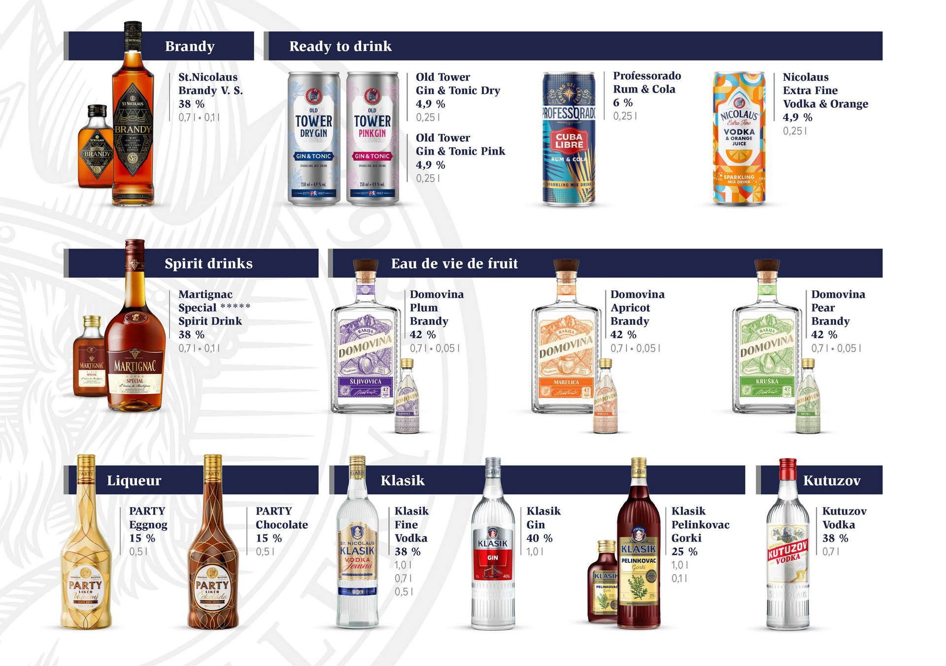St. Nicolaus destilerija ima veliku paletu proizvoda. Ukoliko ste zainteresovani pošaljite nam upit kako bismo vam dostavili kompletan katalog njihovih proizvoda.