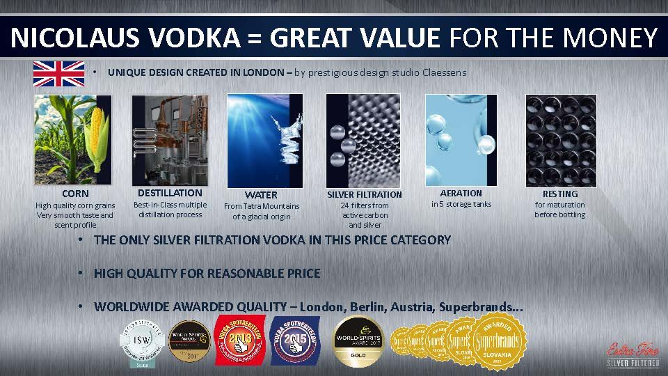 St. Nicolaus je slovačka destilerija koja se proslavila svojim kvalitetnim alkoholnim pićima. Najpoznatiji proizvod ove destilerije je St. Nicolaus votka, koja se pravi od kvalitetnog kukuruznog brašna i destilovana je više puta za maksimalnu čistoću i ukus. Osim vode, St. Nicolaus takođe proizvodi i druga alkoholna pića, kao što su rakija i liker. Sve proizvode krasi visok kvalitet i ukus koji se prepoznaje širom sveta. Ako želite da probate nešto novo i kvalitetno, St. Nicolaus je prava destilerija za vas.